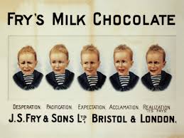 Now best known for their Chocolate Cream and Turkish Delight, the famous firm of J.S. Fry & Sons began with one Dr Joseph Fry producing chocolate in his premises on Small Street in Bristol in the late 1750's. By the close of 19th century the company, trading as J.S. Fry & Sons, had become a vast presence in the centre of the city. In 1847 Fry's produced the first solid chocolate bar for widespread consumption, and in 1902 they began selling the UK's first milk chocolate - 3 years before Cadbury's Dairy Milk was introduced. Fry's branded their new product as 5 Boys Milk Chocolate, linking it in the consumer mind to the trusted 5 Boys (dark) chocolate they had already been producing for some years. The famous advert shows a young boy's face passing through 5 expressions of 'Desperation, Pacification, Expectation, Acclamation and Realization' as he eats his Fry's chocolate. The image was reproduced as a postcard and sold widely at food and industry exhibitions during the Edwardian period. 5 Boys chocolate was produced until the early 1970's.